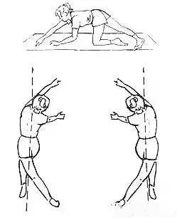 俯跪,左腳向后伸展,過中線,左手向前伸展,過中線,向右邊爬行成一弧度,維持10s,回復(fù)正中,右腳向后伸展,過中線,右手向前伸展,過中線,向左邊爬行成一弧度,維持10s。
