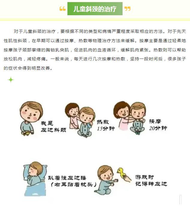 兒童斜頸,簡(jiǎn)單來(lái)說(shuō),就是孩子的頭部向一側(cè)傾斜,而下巴則轉(zhuǎn)向另一側(cè)的一種異常姿勢(shì)。這種情況在嬰幼兒時(shí)期較為常見。引發(fā)兒童斜頸的原因有多種,其中先天性肌性斜頸是較為常見的類型。它主要是由于一側(cè)胸鎖乳突肌攣縮導(dǎo)致的。在孩子出生后不久,家長(zhǎng)可能就會(huì)發(fā)現(xiàn)孩子的頭部總是偏向一側(cè),頸部還可能摸到一個(gè)硬結(jié)。這其實(shí)就是胸鎖乳突肌發(fā)生病變的表現(xiàn)。除了先天性肌性斜頸,還有骨性斜頸,這是由于頸椎骨骼發(fā)育異常引起的,不過(guò)這種情況相對(duì)較少。另外,姿勢(shì)性斜頸也不容忽視,它通常是因?yàn)楹⒆娱L(zhǎng)期保持不良的睡眠姿勢(shì)或者抱姿導(dǎo)致的。如果不及時(shí)糾正,也可能會(huì)逐漸加重,影響孩子的正常發(fā)育。